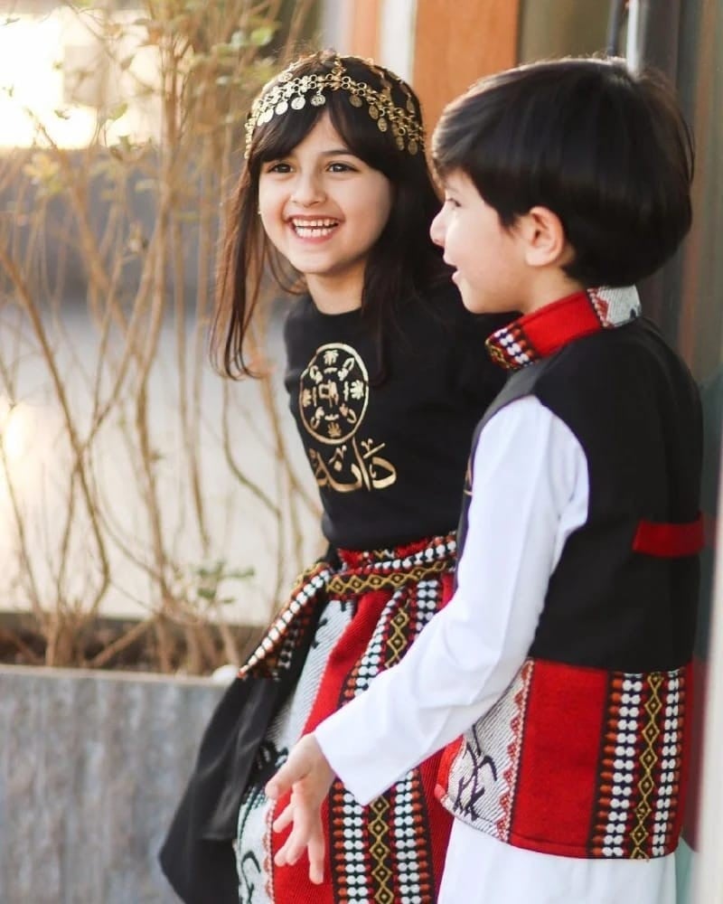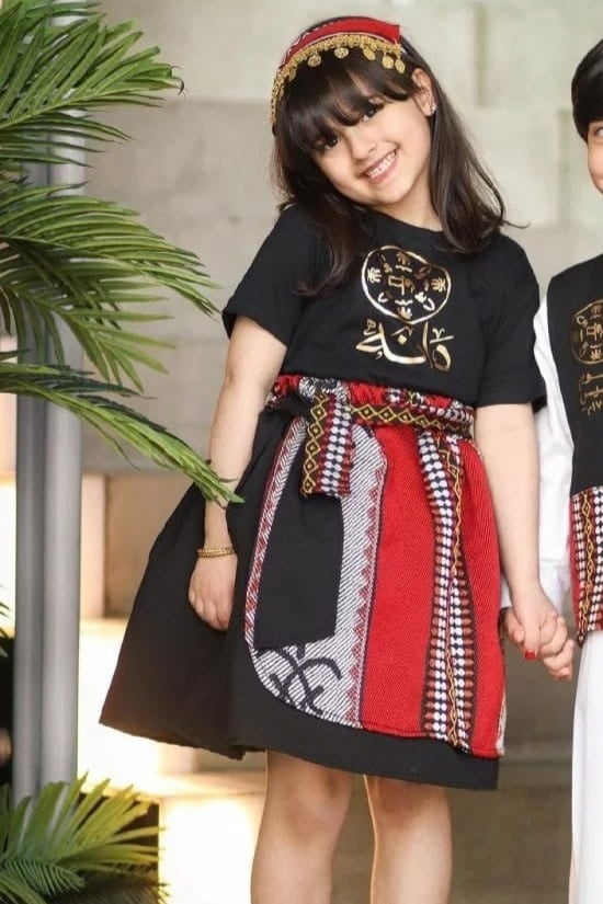 طقم أنيق للأطفال بناتي يتكون من تنورة سدو بتصميم تقليدي وتيشرت أسود ناعم، مع ربطة شعر تراثية. مثالي للاحتفال بيوم التأسيس السعودي، يجمع بين الأناقة والراحة.