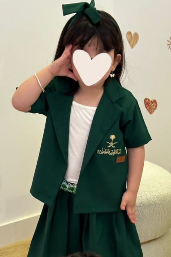 طقم بناتي أنيق ومريح يتكون من تيشيرت، جاكيت، وتنورة، مصنوع من قطن ناعم عالي الجودة يمنح راحة ودفء مناسب للفعاليات والمناسبات. التصميم يحمل ألوان اليوم الوطني الأخضر مع لمسات بيضاء تعكس الفخر والتميز.